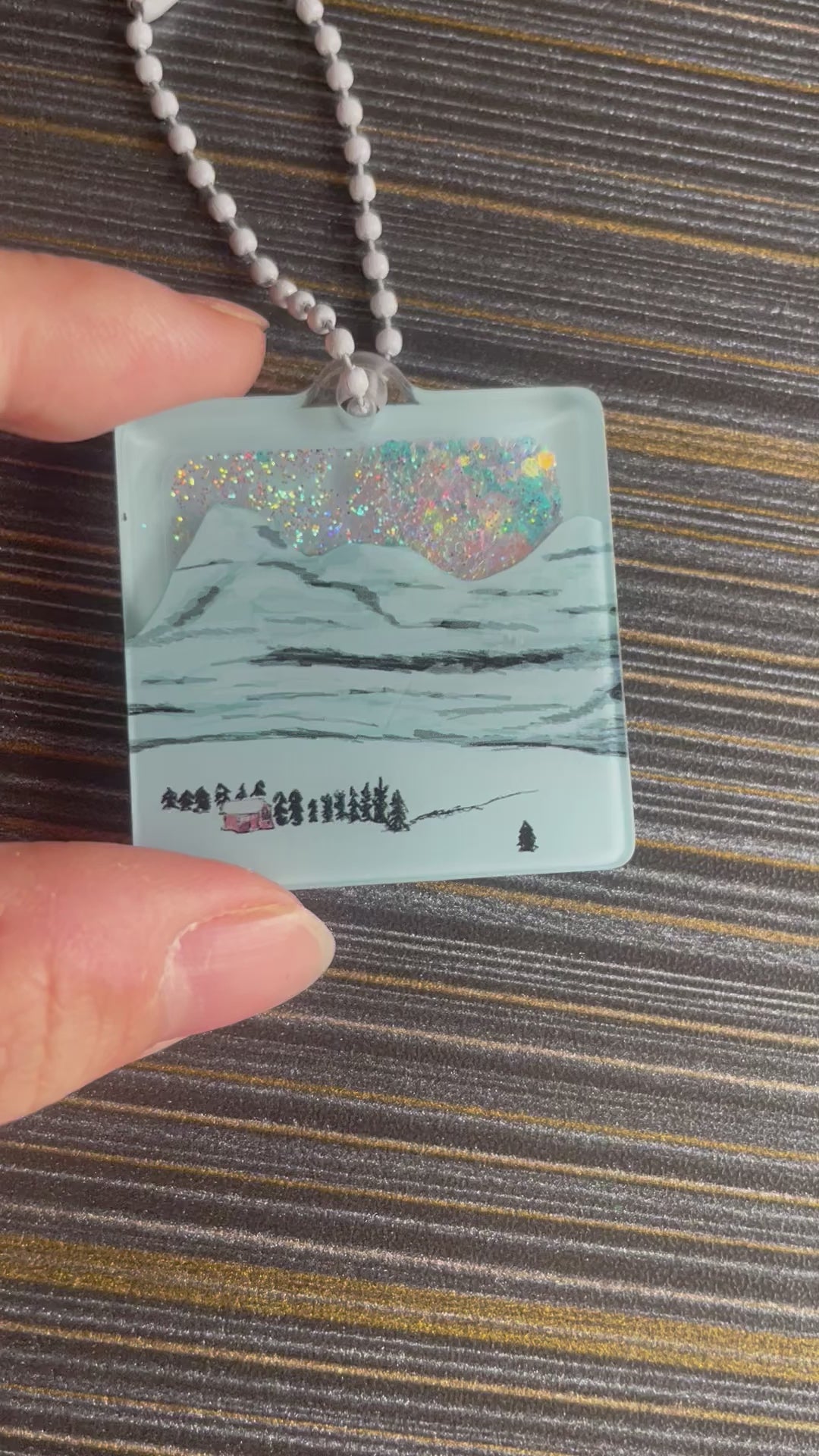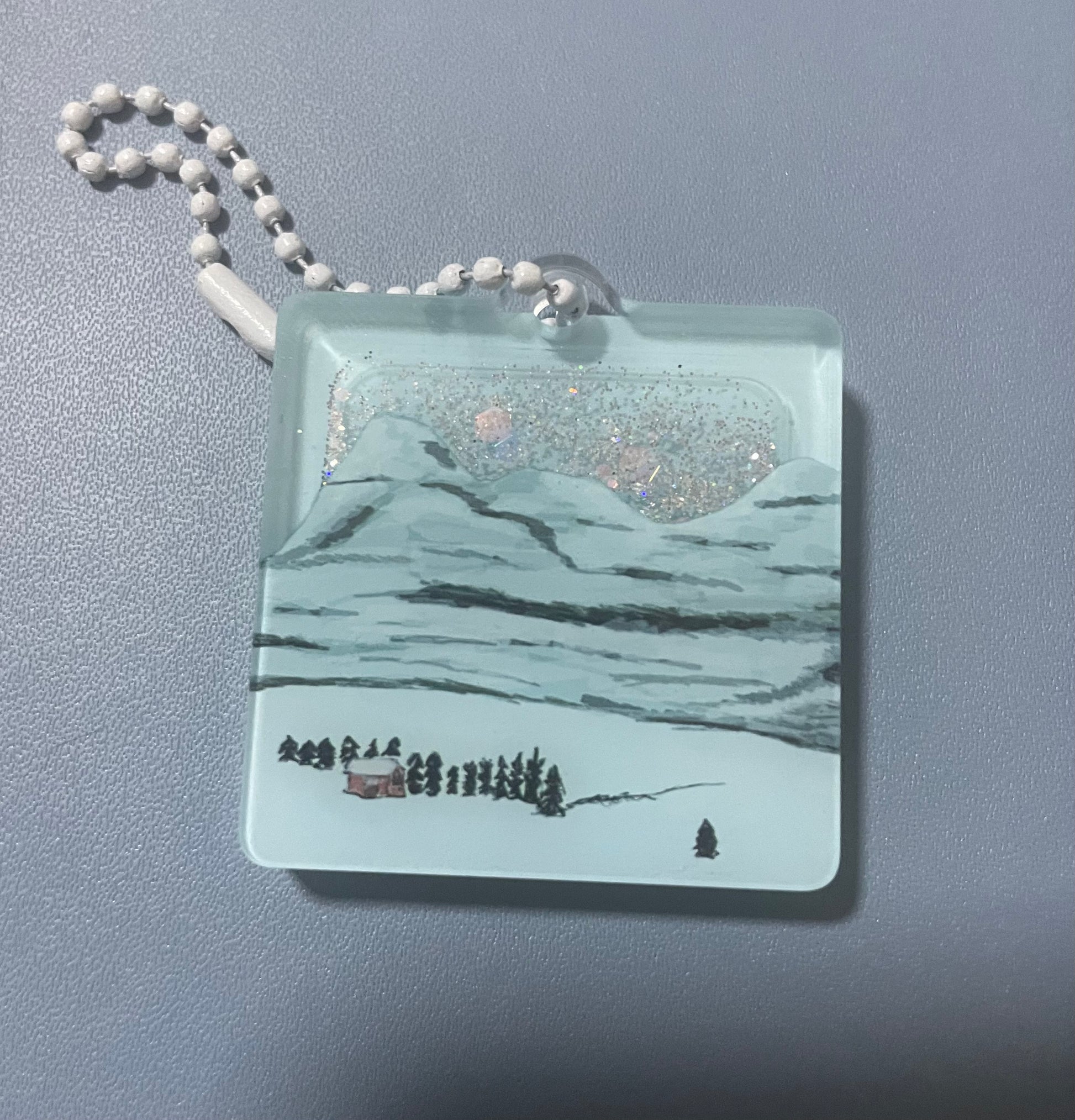 A 4cm by 4cm acrylic keychain with snow-like glitter, inspired by winter in the Swiss Alps 🇨🇭